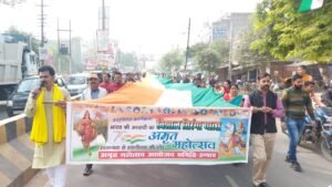 आज़ादी के 75 वे वर्ष को अमृत महोत्सव वर्ष के रूप में पूरा देश मना रहा इसी क्रम में बीरांगना रानी लक्ष्मी बाई जी की जयंती पर उद्घाटन कार्यक्रम में शहर के रामलीला मैदान से वृंदावन गार्डन आवास विकास तक 151 मीटर तिरंगे व हजारो राष्ट्र प्रेमियों के साथ अमृत महोत्सव आयोजन समिति के जिला संयोजक विमल द्विवेदी की अगुवाई में एक भव्य तिरंगा यात्रा निकाली गयी जिसे हरी झंडी विभाग प्रचारक आलोक द्वारा दिखाई गयी पूरी यात्रा के दौरान भारत माता की जय ,वंदे मातरम के गगन भेदी नारों से माहौल पूरी तरह राष्ट्रभक्ति वाला बन गया नगर में यात्रा के दौरान नगर वासियो व व्यवसायियी द्वारा जगह जगह पुष्प वर्षा व भारत माता का पूजन कर आरती की गयी कार्यक्रम का समापन वृंदावन गार्डन में भारत माता का पूजन ,महाआरती व बंदेमातरम गान से हुवा ।