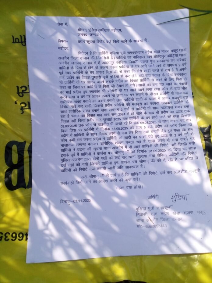 उन्नाव जनपद के अजगैन थाना क्षेत्र से एक अत्यंत गंभीर मामला सामने आया है, जिसने स्थानीय पुलिस की कार्यप्रणाली पर कई सवाल खड़े कर दिए हैं। पीड़िता द्वारा 3 नवम्बर को प्रार्थना पत्र देने के बाद भी आज तक किसी भी प्रकार की ठोस कार्रवाई न होना अपने-आप में जांच का विषय है। लड़की पक्ष कई बार थाना पहुंच चुका है, लेकिन पुलिस अब तक लड़का पक्ष को बुलाने तक में असक्षम साबित हुई है, जबकि पीड़िता का आरोप है कि आरोपी ने शादी का झांसा देकर दो वर्षों तक उसका शारीरिक शोषण किया।