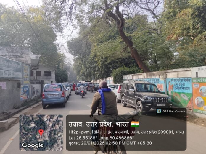 उन्नाव में यातायात व्यवस्था बेहाल, नो-पार्किंग सिर्फ बोर्डों तक सीमित, चौराहों पर जाम, फुटपाथ बने पार्किंग स्थल, एंबुलेंस फंसी, पुलिस मूकदर्शक, आमजन त्रस्त